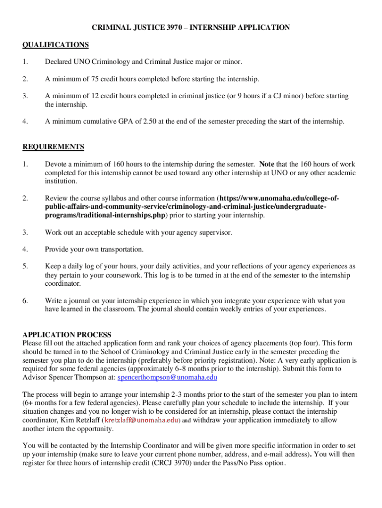 CRIMINAL JUSTICE 3970 INTERNSHIP APPLICATION QUALIFICATIONS 1. Declared UNO Criminology and Criminal Justice major or minor.2. A minimum of 75 credit hours completed before starting the internship.3.
