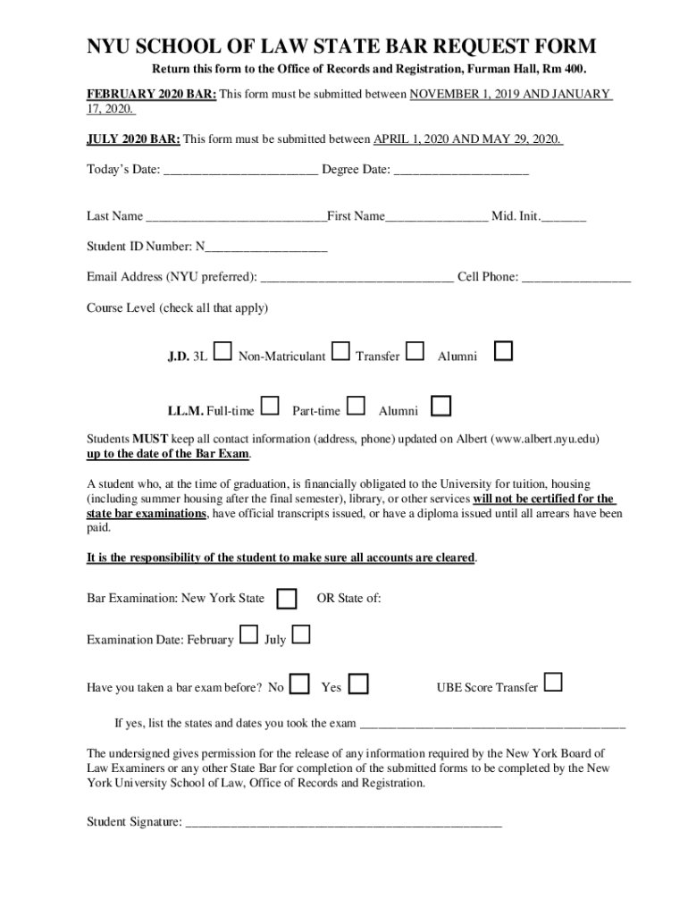 NYU SCHOOL OF LAW STATE BAR REQUEST FORM Return this form to the Office of Records and Registration, Furman Hall, Rm 400. FEBRUARY 2020 BAR: This form must be submitted between NOVEMBER 1, 2019, AND