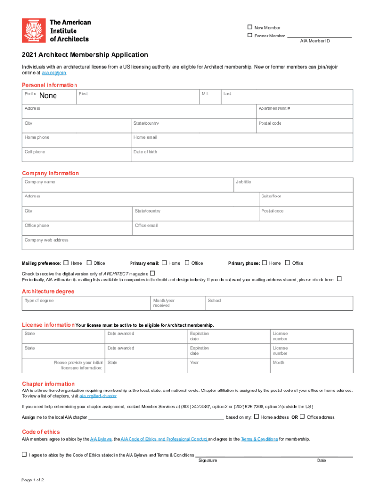 New MemberFormer Member ID2021 Architect Membership Application Individuals with an architectural license from a US licensing authority are eligible for Architect membership. New or former members