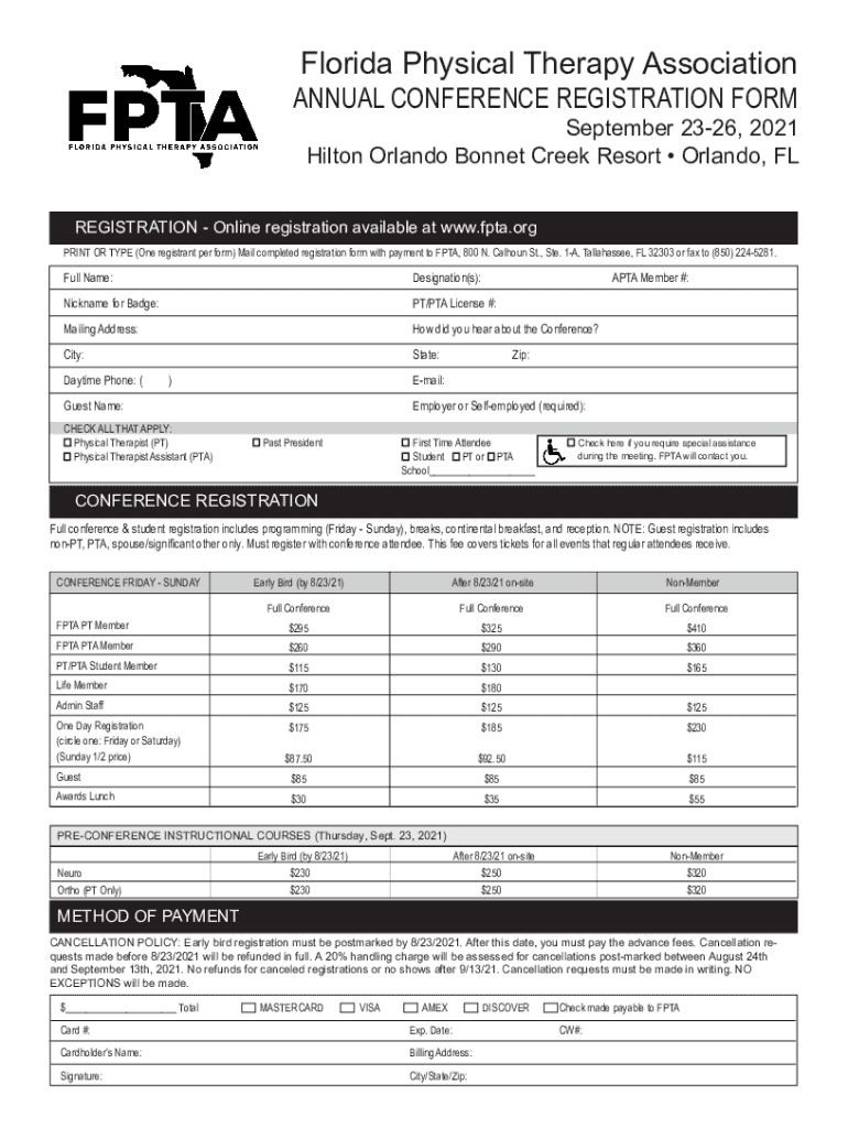 Florida Physical Therapy AssociationANNUAL CONFERENCE REGISTRATION FORM September 2326, 2021 Hilton Orlando Bonnet Creek Resort Orlando, REGISTRATION Online registration available at www.fpta.org