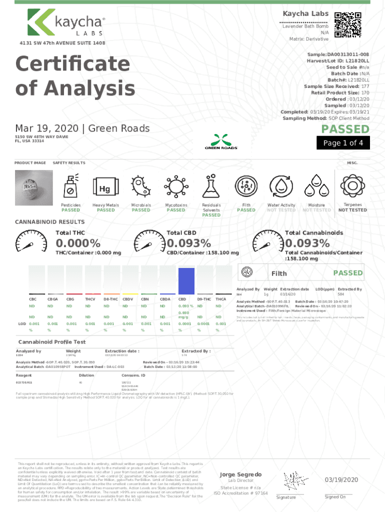 Get the free N/A Matrix: Derivative Certicate Harvest/Lot ID: L21420EL of Analysis