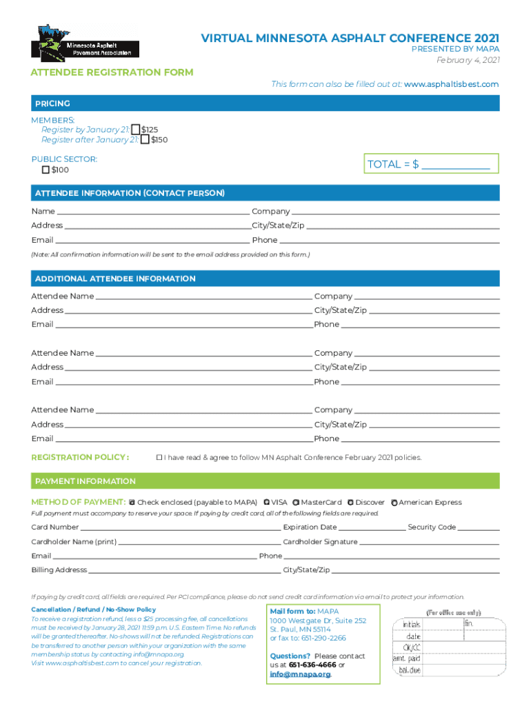VIRTUAL MINNESOTA ASPHALT CONFERENCE 2021 PRESENTED BY MAPA February 4, 2021ATTENDEE REGISTRATION Forms form can also be filled out at: www.asphaltisbest.comPRICING MEMBERS: Register by January 21: