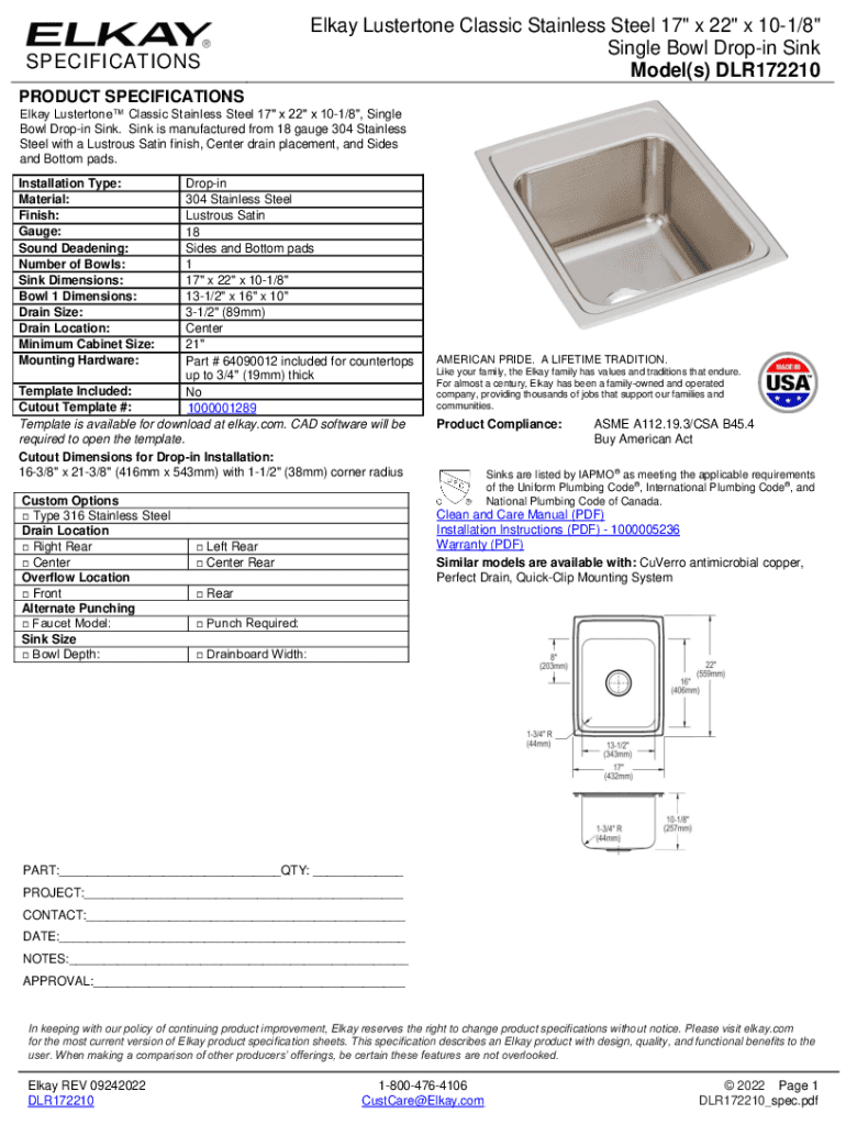 SPECIFICATIONSElkay Luster tone Classic Stainless Steel 17\” x 22\” x 101/8\” Single Bowl Drop in Sink Model(s) DLR172210PRODUCT SPECIFICATIONS Elway Luster tone Classic Stainless Steel 17\”