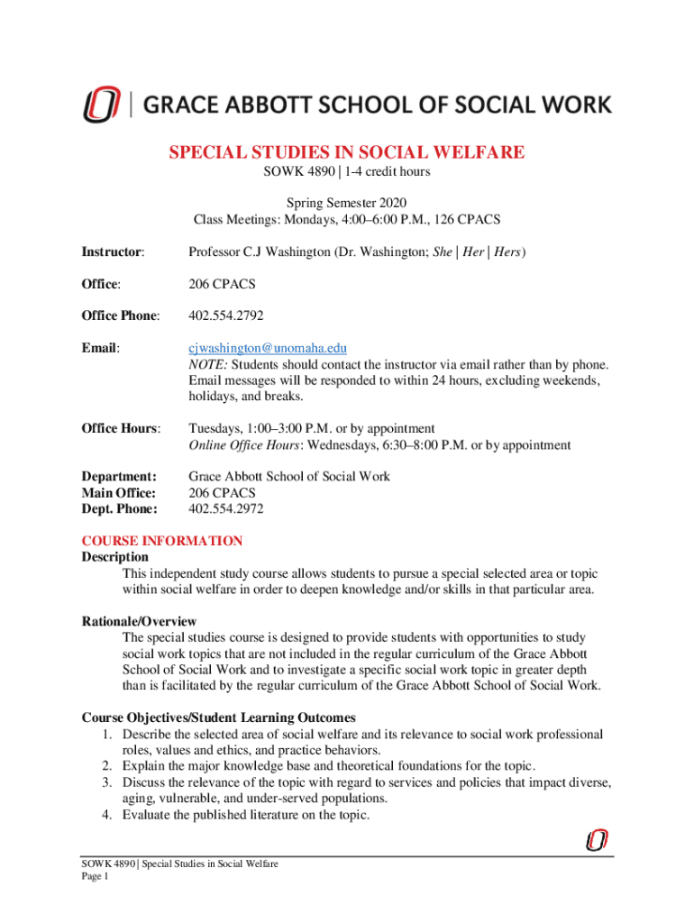 SPECIAL STUDIES IN SOCIAL WELFARE SOCK 4890 | 14 credit hours Spring Semester 2020 Class Meetings: Mondays, 4:006:00 P.M., 126 PACS Instructor:Professor C. J Washington (Dr. Washington; She | Her