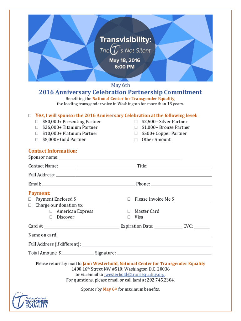 May 6th2016 Anniversary Celebration Partnership Commitment Benefiting the National Center for Transgender Equality, the leading transgender voice in Washington for more than 13 years. Yes, I will