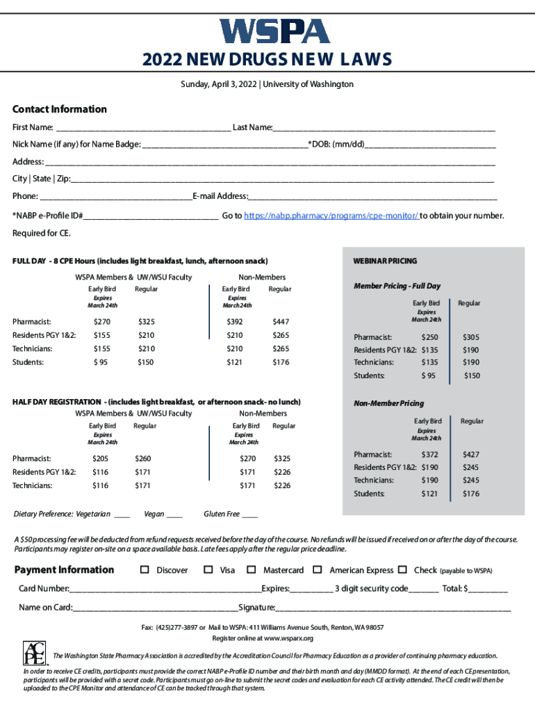 2022 NEW DRUGS NEW LAWS Sunday, April 3, 2022 | University of WashingtonContact Information First Name:___ Last Name:___ Nick Name (if any) for Name Badge: ___*DOB: (mm/dd)___ Address: ___ City |