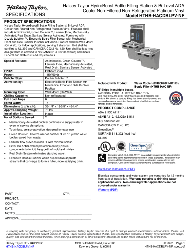 Halsey Taylor Hydrologist Bottle Filling Station & Level ADA Cooler Unfiltered Unrefrigerated Platinum Vinyl Model HTHBHACDBLPVNFSPECIFICATIONS PRODUCT SPECIFICATIONS Halsey Taylor Hydrologist Bottle