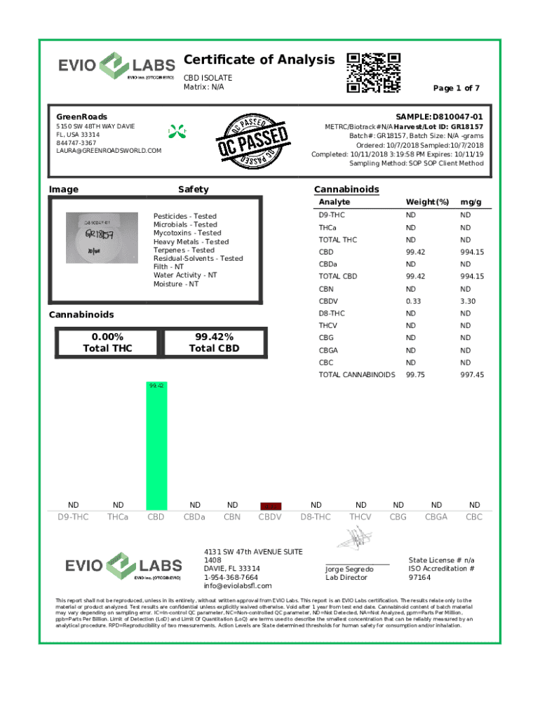 Certificate of Analysis CBD ISOLATE Matrix: N/Page 1 of 7GreenRoadsSAMPLE:D810047015150 SW 48TH WAY DAVIE FL, USA 33314 8447473367 LAURA@GREENROADSWORLD.COMImageMETRC/Biotrack#N/A Harvest/Lot ID:
