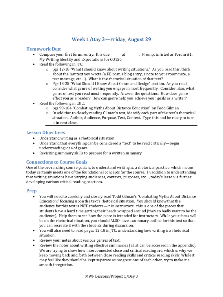 Week 1/Day 3Friday, August 29 Homework Due: Compose your first forum entry. It is due ___ at ___. Prompt is listed as Forum #1: My Writing Identity and Expectations for CO150. Read the following in