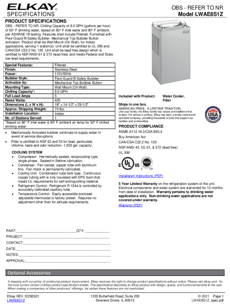OBS REFER TO NR Model LWAE8S1ZSPECIFICATIONS PRODUCT SPECIFICATIONS OBS REFER TO NR. Chilling Capacity of 8.0 MPH (gallons per hour) of 50 F drinking water, based on 80 F inlet water and 90 F ambient,