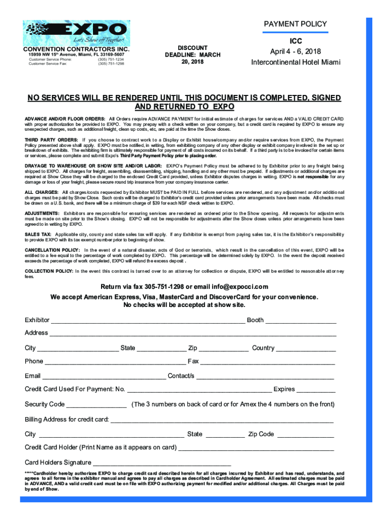 PAYMENT POLICY DISCOUNT DEADLINE: MARCH 20, 2018ICC April 4 6, 2018 Intercontinental Hotel Miami NO SERVICES WILL BE RENDERED UNTIL THIS DOCUMENT IS COMPLETED, SIGNED AND RETURNED TO EXPO ADVANCE