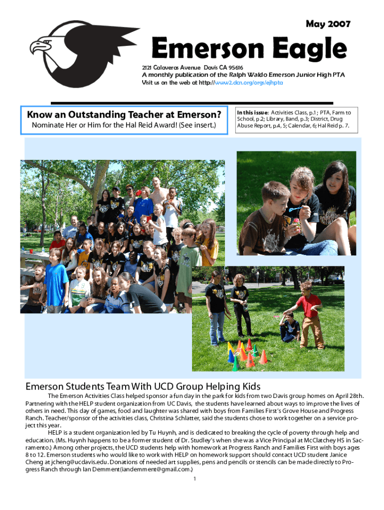 May 2007Emerson Eagle 2121 Calaveras Avenue Davis CA 95616 A monthly publication of the Ralph Waldo Emerson Junior High PTA Visit us on the web at http://www2.dcn.org/orgs/ejhptaKnow an Outstanding