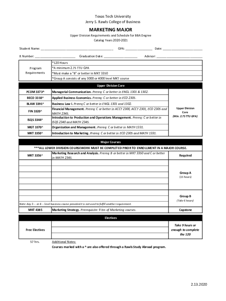 Texas Tech University Jerry S. Rails College of BusinessMARKETING MAJOR Upper Division Requirements and Schedule for BBA Degree Catalog Years 20202021 Student Name: ___ R Number: ___ Program Requirements