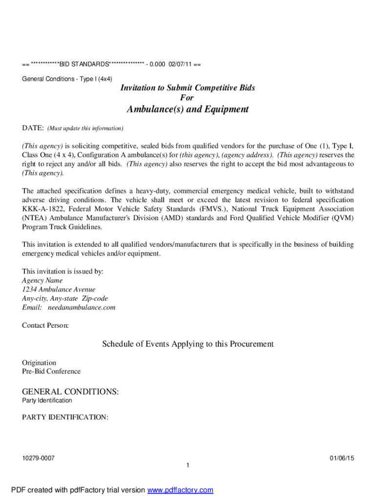 ************BID STANDARDS*************** 0.000 02/07/11 General Conditions Type I (4×4)Invitation to Submit Competitive Bids Ambulance(s) and Equipment DATE: (Must update this information) (This