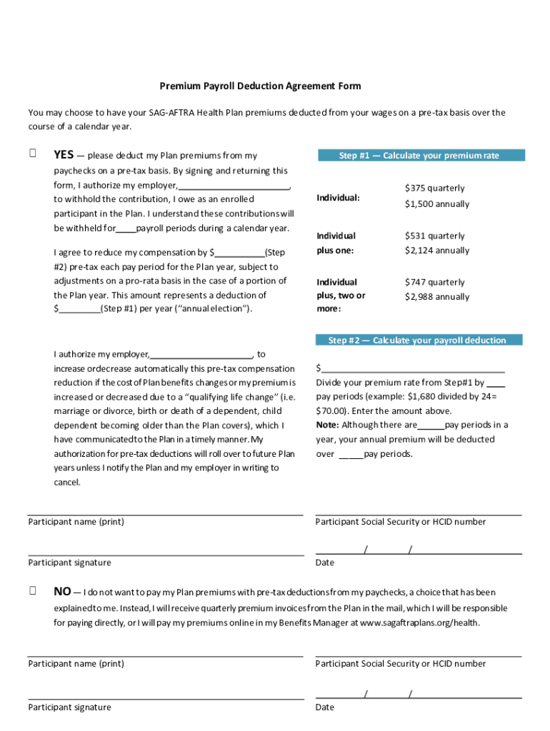 Premium Payroll Deduction Agreement Form You may choose to have your SAHARA Health Plan premiums deducted from your wages on a pretax basis over the course of a calendar year. YES please deduct my