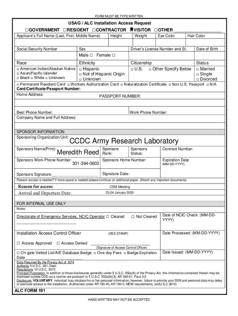 FORM MUST BE TYPE WRITTENUSAG / ALC Installation Access RequestGOVERNMENT RESIDENT CONTRACTOR VISITOR OTHER ___ Applicants Full Name (Last, First, Middle Name) Social Security NumberHeightWeightSexEye