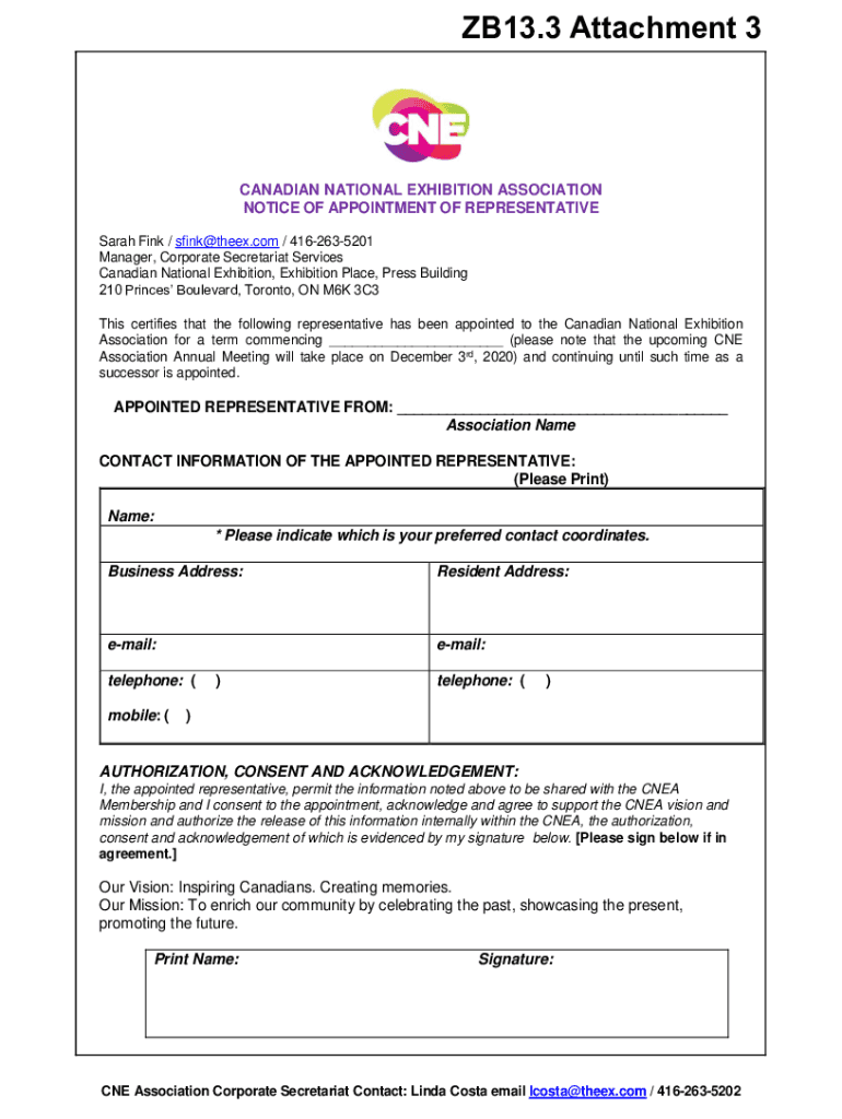ZB13.3 Attachment 3CANADIAN NATIONAL EXHIBITION ASSOCIATION NOTICE OF APPOINTMENT OF REPRESENTATIVE Sarah Fink / sfink@theex.com / 4162635201 Managers, Corporate Secretariat Services Canadian National
