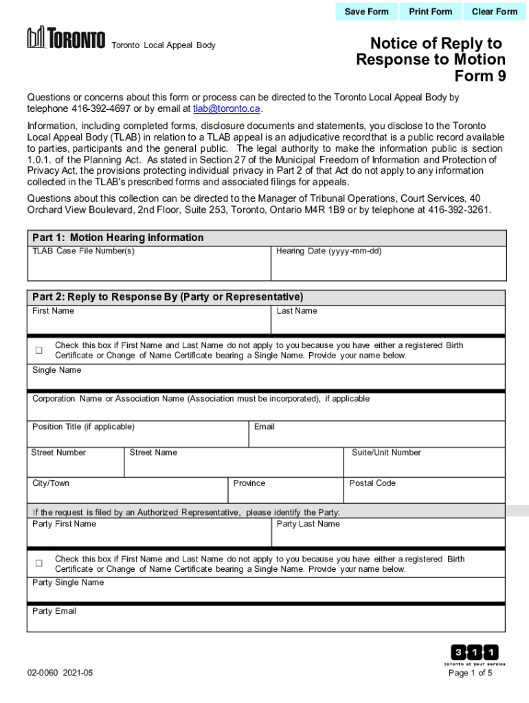 Save Footprint Formulae Formative of Reply to Response to Motion Form 9Toronto Local Appeal BodyQuestions or concerns about this form or process can be directed to the Toronto Local Appeal Body by