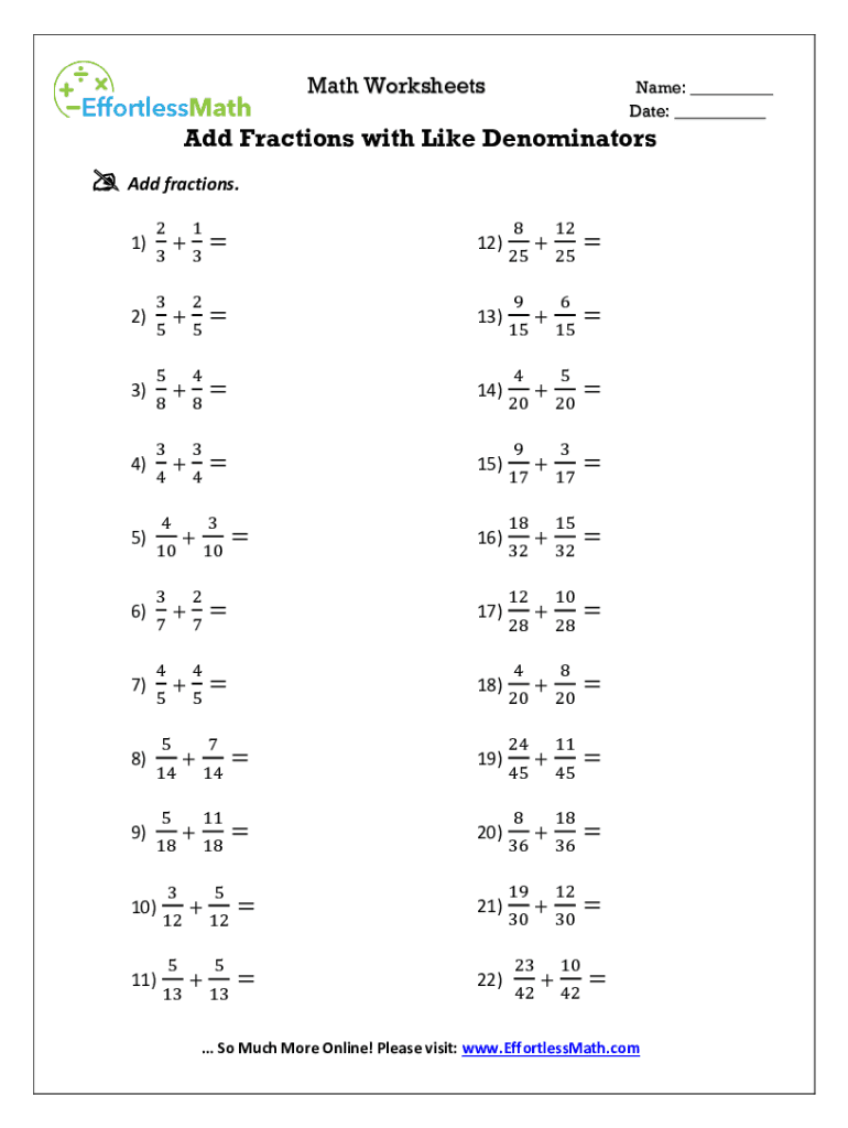 Math WorksheetsName: ___ Date: ___Add Fractions with Like Denominators Add fractions. 1)2)3)4)5)6)7)8)9)2+3 3+5 5+8 3+4 410 34+5 514 5 1810)11)3 2 5 4 8 3 47 4 5+3 12 5 1312)13)14)15)102+3++7117)18)14