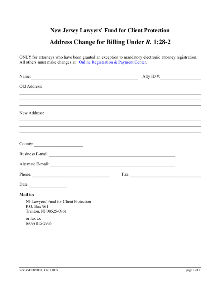 SavePrintClearNew Jersey Lawyers Fund for Client ProtectionAddress Change for Billing Under R. 1:282 ONLY for attorneys who have been granted an exception to mandatory electronic attorney registration.