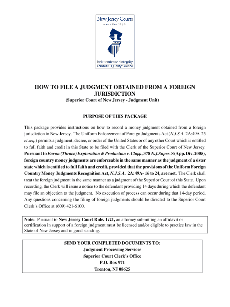 HOW TO FILE A JUDGMENT OBTAINED FROM A FOREIGN JURISDICTION (Superior Court of New Jersey Judgment Unit) ___ PURPOSE OF THIS PACKAGE provides instructions on how to record a money judgment obtained
