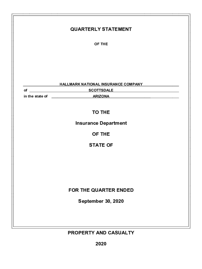 QUARTERLY STATEMENT OF HALLMARK NATIONAL INSURANCE COMPANY of in the state Scottsdale ARIZONA THE Insurance Department OF THE STATE OFFER THE QUARTER ENDED September 30, 2020PROPERTY AND CASUALTY