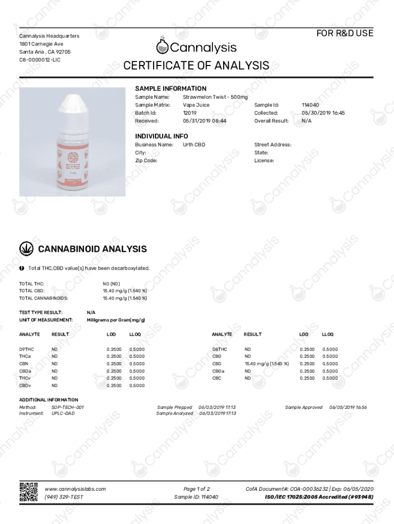 FOR R&D USECannalysis Headquarters 1801 Carnegie Ave Santa Ana, CA 92705 C80000012LICCERTIFICATE OF ANALYSIS SAMPLE INFORMATION Sample Name: Sample Matrix: Batch I'd: Received:Straw melon Twist 500 mg