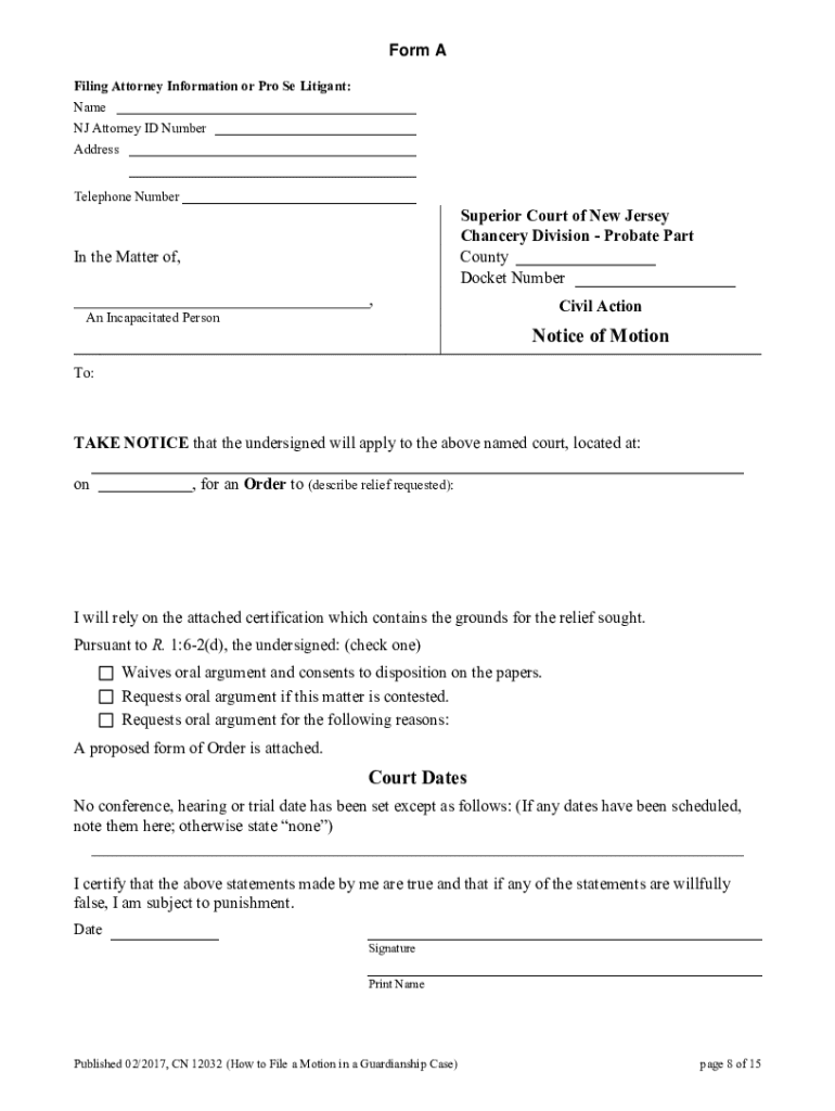 Chancery Probate How to File a Motion in a Guardianship Case February 2017How to File a Motion in a Guardianship Case (Superior Court of New Jersey Chancery Division Probate Part)Who Should Use This