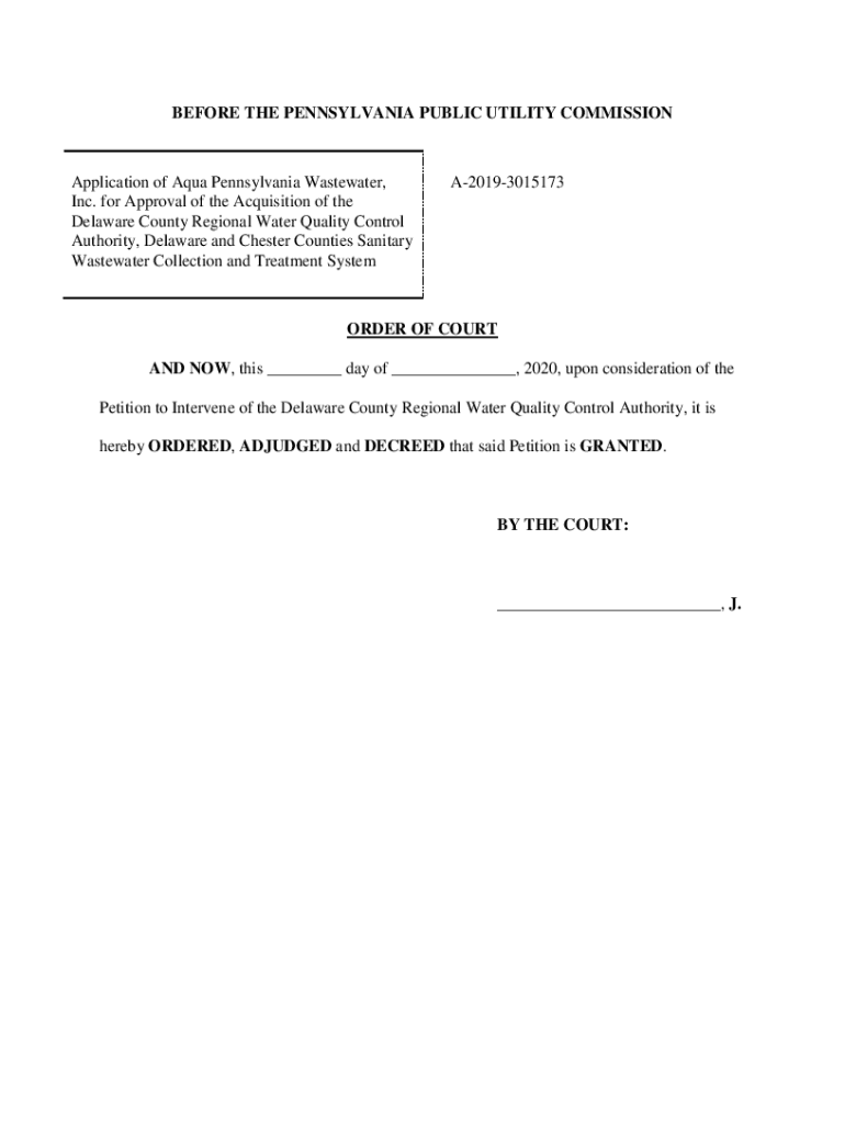 BEFORE THE PENNSYLVANIA PUBLIC UTILITY COMMISSIONApplication of Aqua Pennsylvania Wastewater, Inc. for Approval of the Acquisition of the Delaware County Regional Water Quality Control Authority,