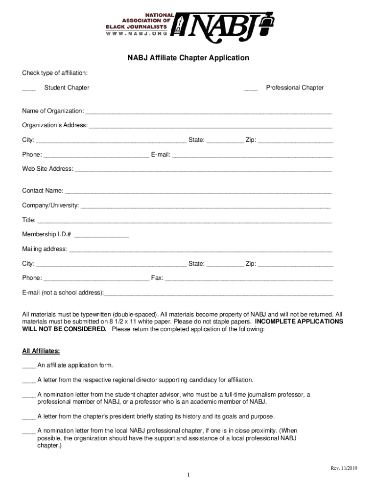 The NABJ Affiliation Chapter Applicationdoc must be completed with the necessary information about the group or organization seeking affiliation and submitted to the NABJ headquarters.