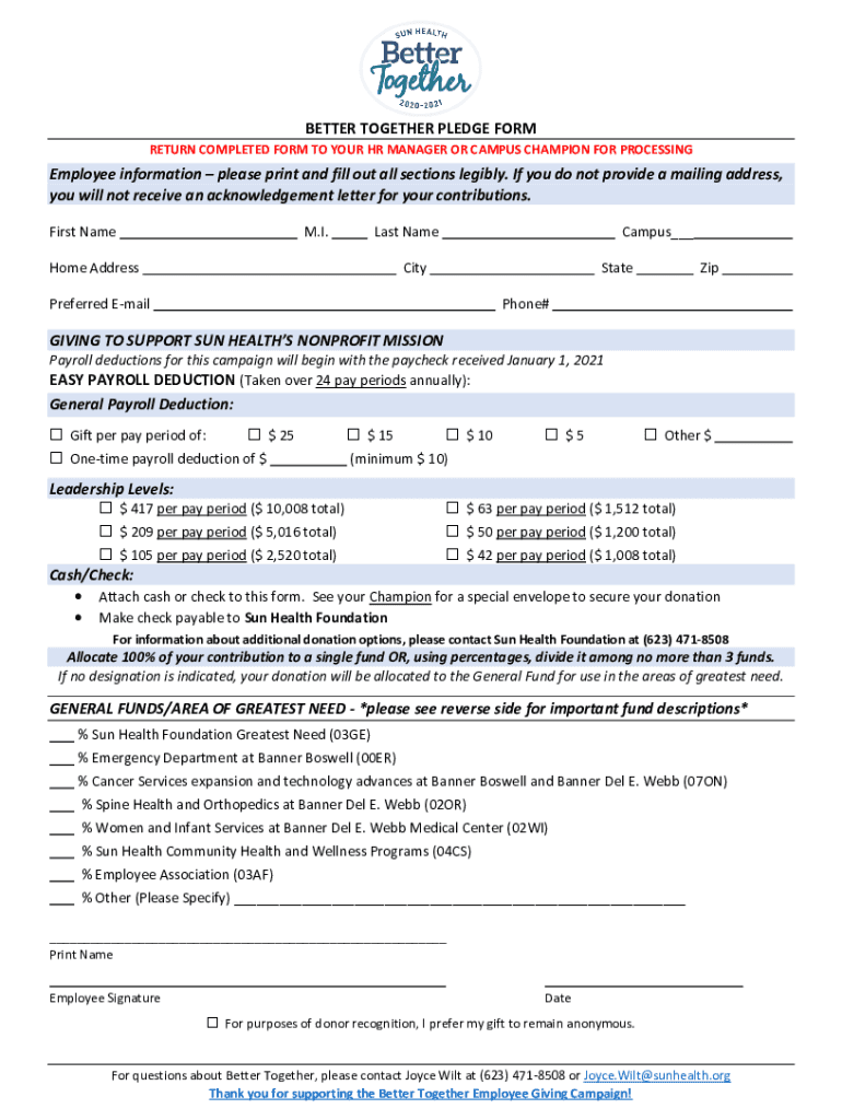 BETTER TOGETHER PLEDGE FORM RETURN COMPLETED FORM TO YOUR HR MANAGER OR CAMPUS CHAMPION FOR PROCESSINGEmployee information please print and fill out all sections legibly. If you do not provide a mailing