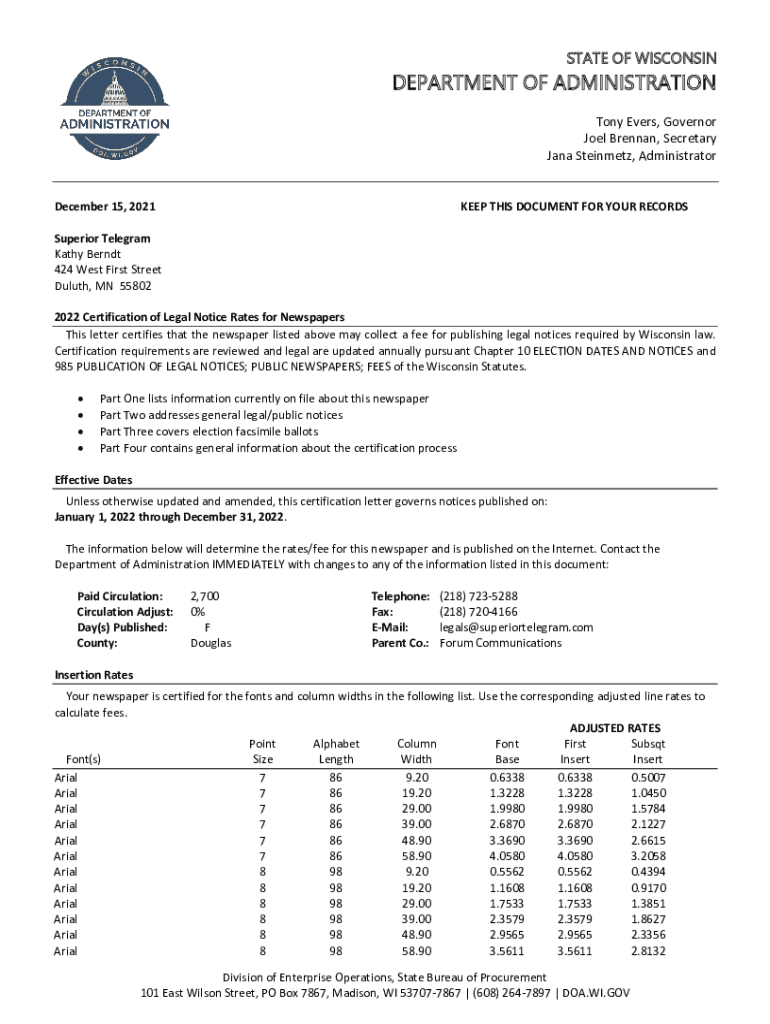 STATE OF WISCONSINDEPARTMENT OF ADMINISTRATION Tony Evers, Governor Joel Brennan, Secretary Jana Steinmetz, Administrator December 15, 2021KEEP THIS DOCUMENT FOR YOUR RECORDS Superior Telegram Kathy