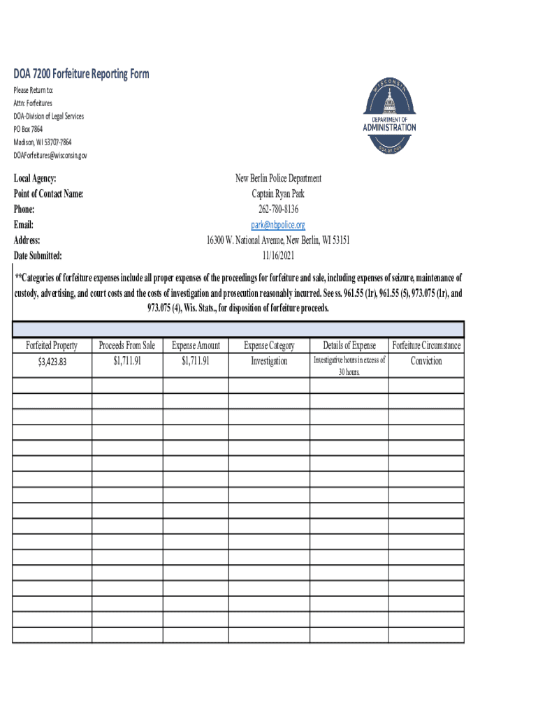 DOA 7200 Forfeiture Reporting Form Please Return to: Attn: Forfeitures Division of Legal Services PO Box 7864 Madison, WI 537077864 DOAForfeitures@wisconsin.govLocal Agency: Point of Contact Name: