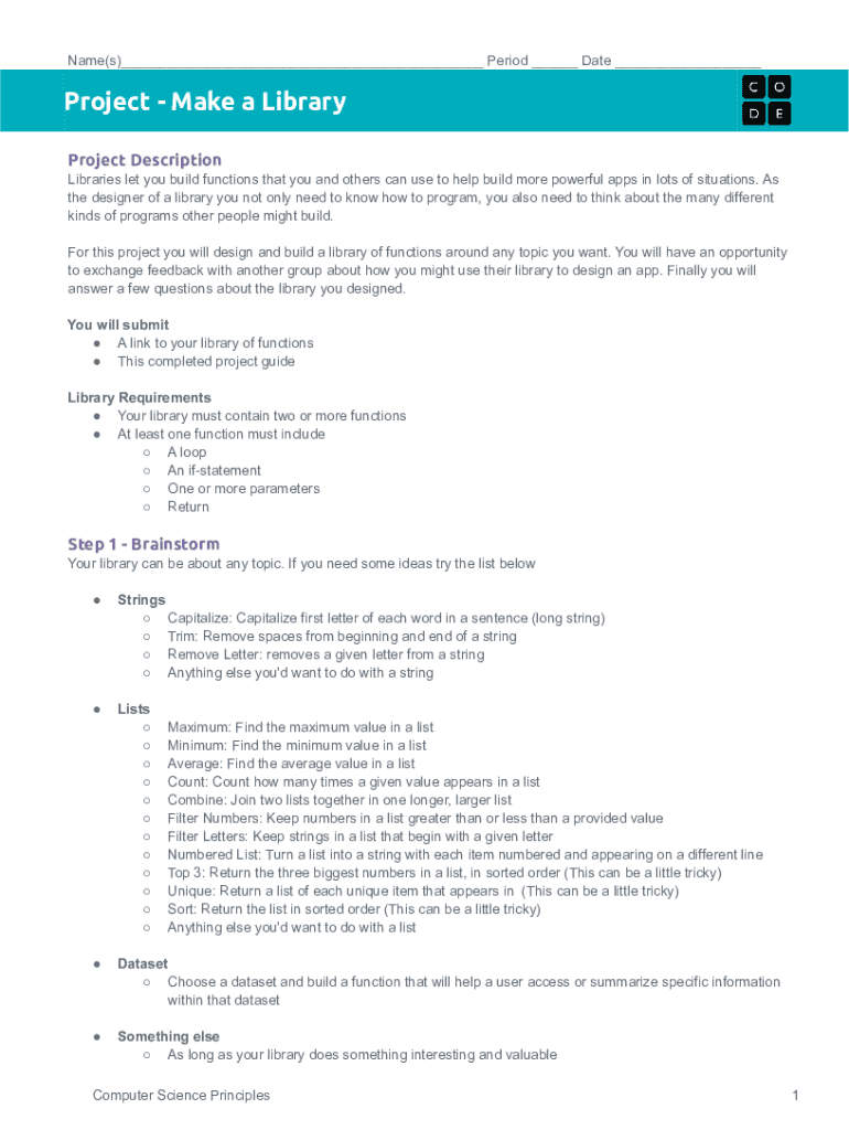 Name(s)___ Period ___ Date ___Project Make a Library Project Description Libraries let you build functions that you and others can use to help build more powerful apps in lots of situations. As the