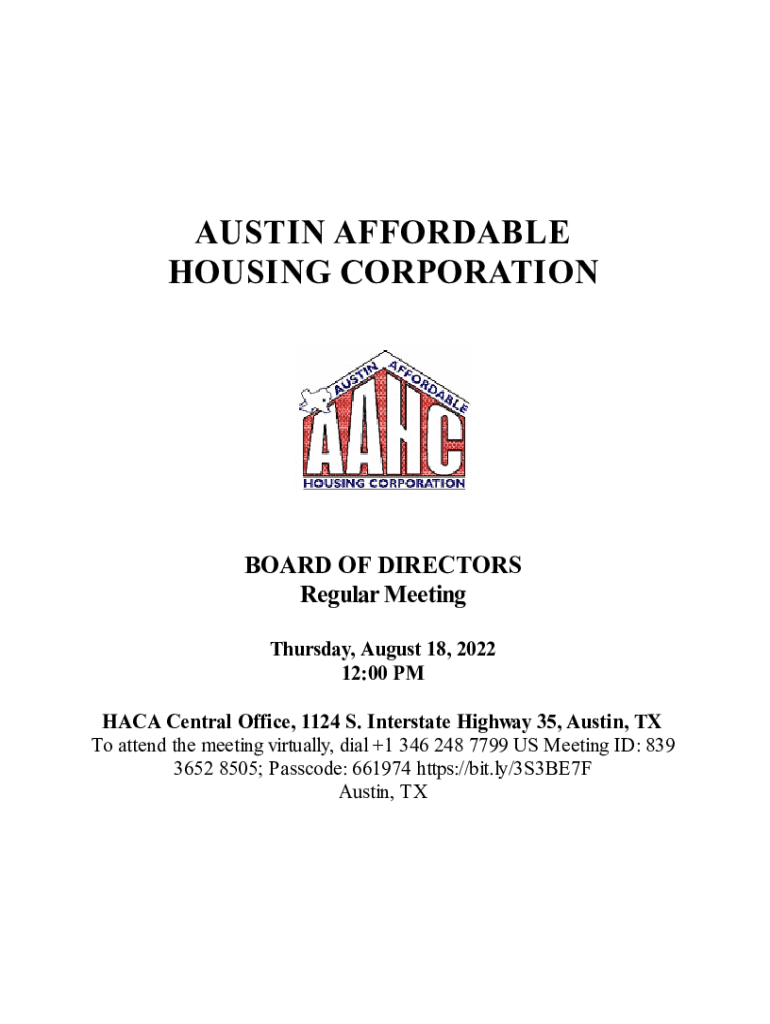 AUSTIN AFFORDABLE HOUSING CORPORATIONBOARD OF DIRECTORS Regular Meeting Thursday, August 18, 2022 12:00 PM HACK Central Office, 1124 S. Interstate Highway 35, Austin, TX To attend the meeting virtually,