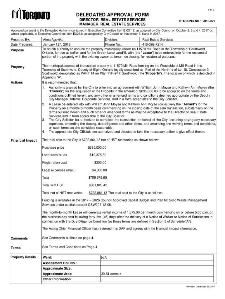 Get the free www.toronto.ca 8e28/2018/02111570-Mill-Rd1 of 5 DELEGATED APPROVAL FORM DIRECTOR, RE...