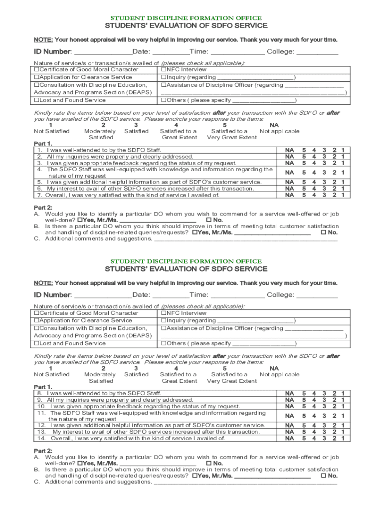 STUDENT DISCIPLINE FORMATION OFFICESTUDENTS EVALUATION OF SFO SERVICE NOTE: Your honest appraisal will be very helpful in improving our service. Thank you very much for your time. ID Number: ___Date: