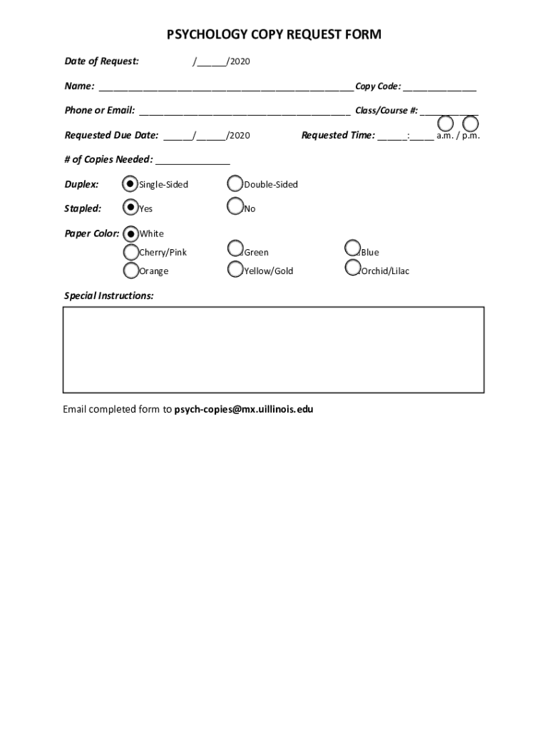 PSYCHOLOGY COPY REQUEST FORM Date of Request:___/___/2020Name: ___ Copy Code: ___ Phone or Email: ___ Class/Course #: ___ Requested Due Date: ___/___/2020Requested Time: ___:___ a.m. / p.m.# of Copies