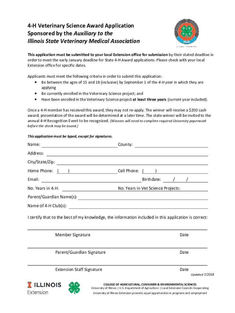 4H Veterinary Science Award Application Sponsored by the Auxiliary to the Illinois State Veterinary Medical Association This application must be submitted to your local Extension office for submission