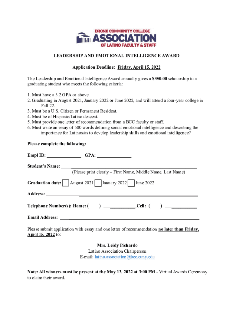 LEADERSHIP AND EMOTIONAL INTELLIGENCE AWARD Application Deadline: Friday, April 15, 2022, The Leadership and Emotional Intelligence Award annually gives a $350.00 scholarship to a graduating student