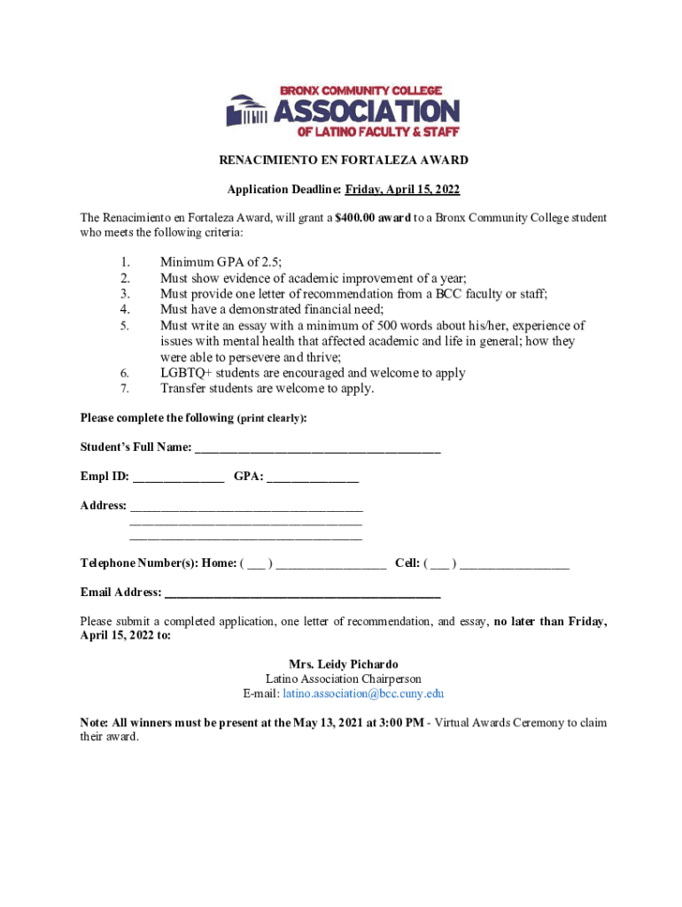 RENACIMIENTO EN FORTALEZA AWARD Application Deadline: Friday, April 15, 2022, The Renacimiento en Fortaleza Award, will grant a $400.00 award to a Bronx Community College student who meets the following
