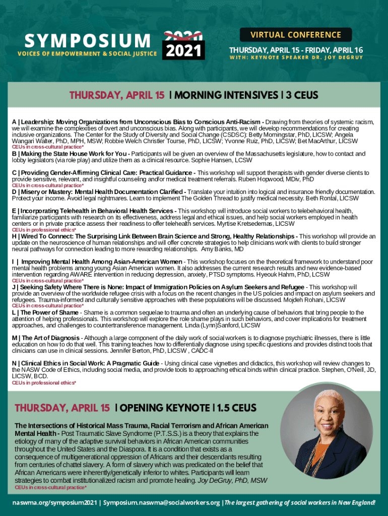 SYMPOSIUM 2020VOICES OF EMPOWERMENT & SOCIAL JUSTICE2021VIRTUAL CONFERENCE THURSDAY, APRIL 15 FRIDAY, APRIL 16WITH: KEYNOTE SPEAKER DR. JOY DEGRUYTHURSDAY, APRIL 15 | MORNING INTENSIVES | 3 ZEUS A