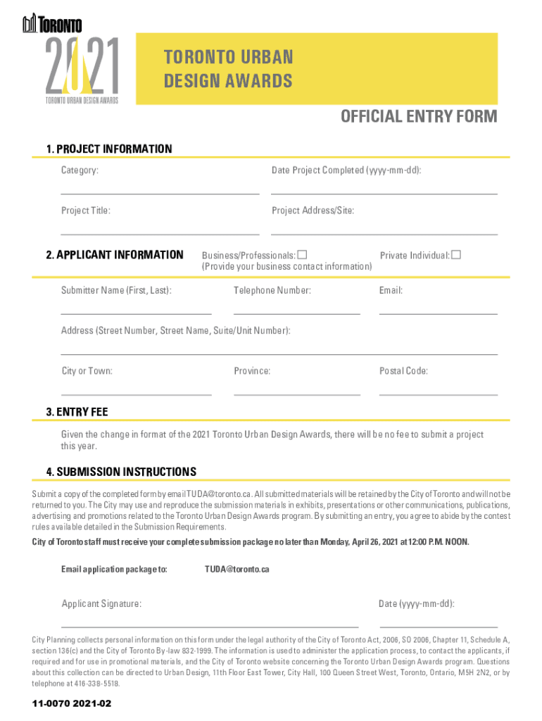 To fill out Toronto Urban Design Awards, applicants must submit their project information, images, and descriptions through the official submission process.