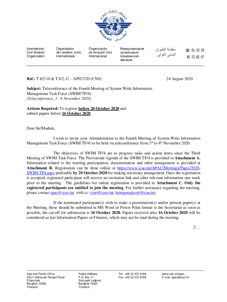 International Civil Aviation OrganizationOrganisation de aviation civil internationaleOrganizacin de Aviation Civil International Ref.: T 8/2.10 & T 8/2.11 AP037/20 (CNS) 24 August 2020Subject: Teleconference