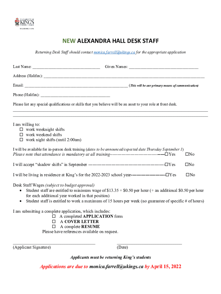 NEW ALEXANDRA HALL DESK STAFF Returning Desk Staff should contact monica.farrell@ukings.ca for the appropriate application Last Name: ___Given Names: ___Address (Halifax): ___ Email: ___ (This will