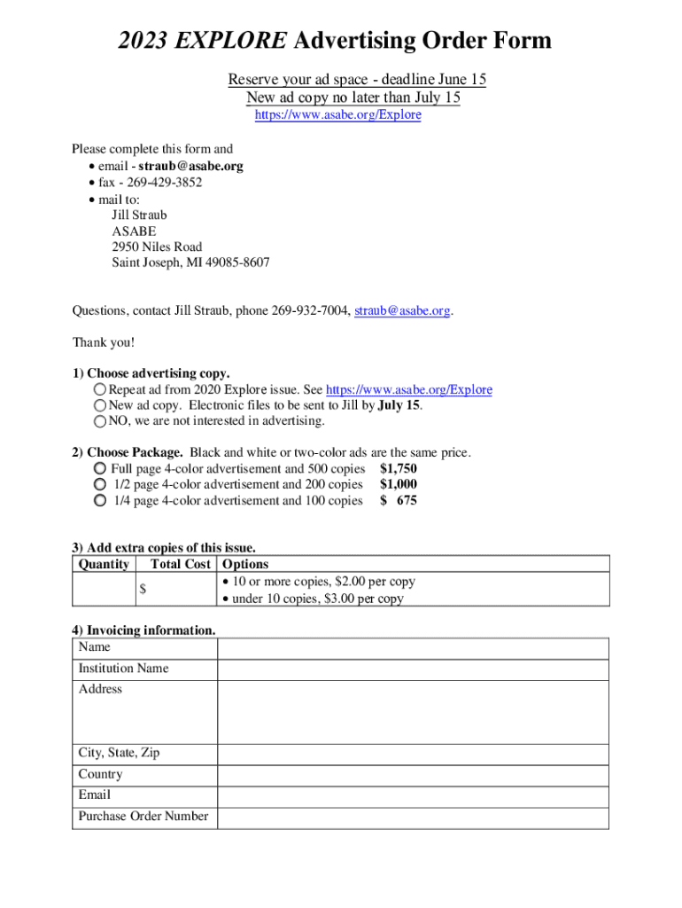 2023 EXPLORE Advertising Order Form Reserve your ad space deadline June 15 New ad copy no later than July 15 https://www.asabe.org/Explore Please complete this form and email straub@asabe.org fax