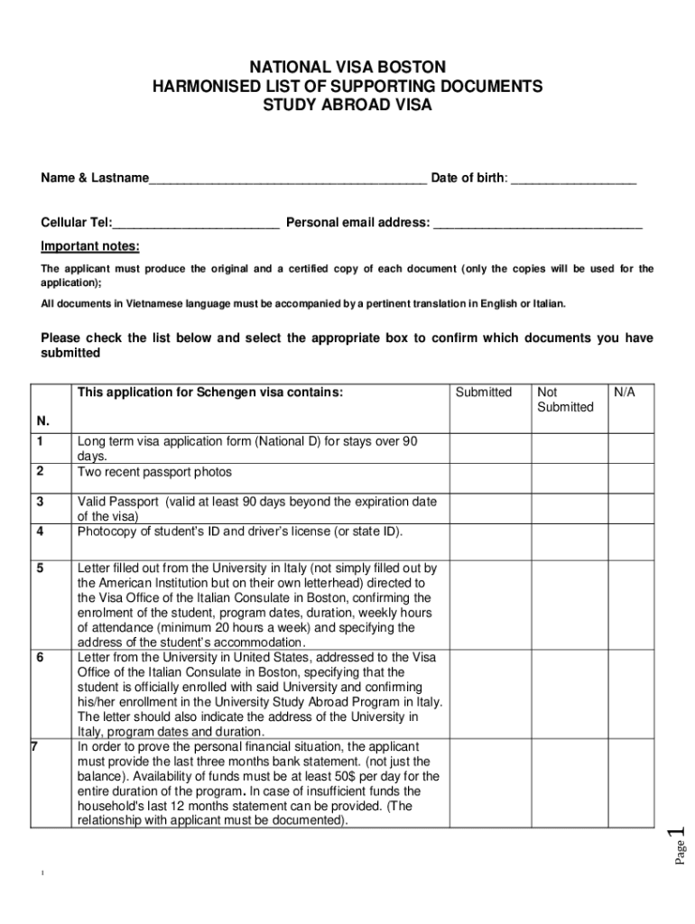 NATIONAL VISA BOSTON Harmonized LIST OF SUPPORTING DOCUMENTS STUDY ABROAD Misname & Last name___ Date of birth: ___Cellular Tel:___ Personal email address: ___ Important notes: The applicant must