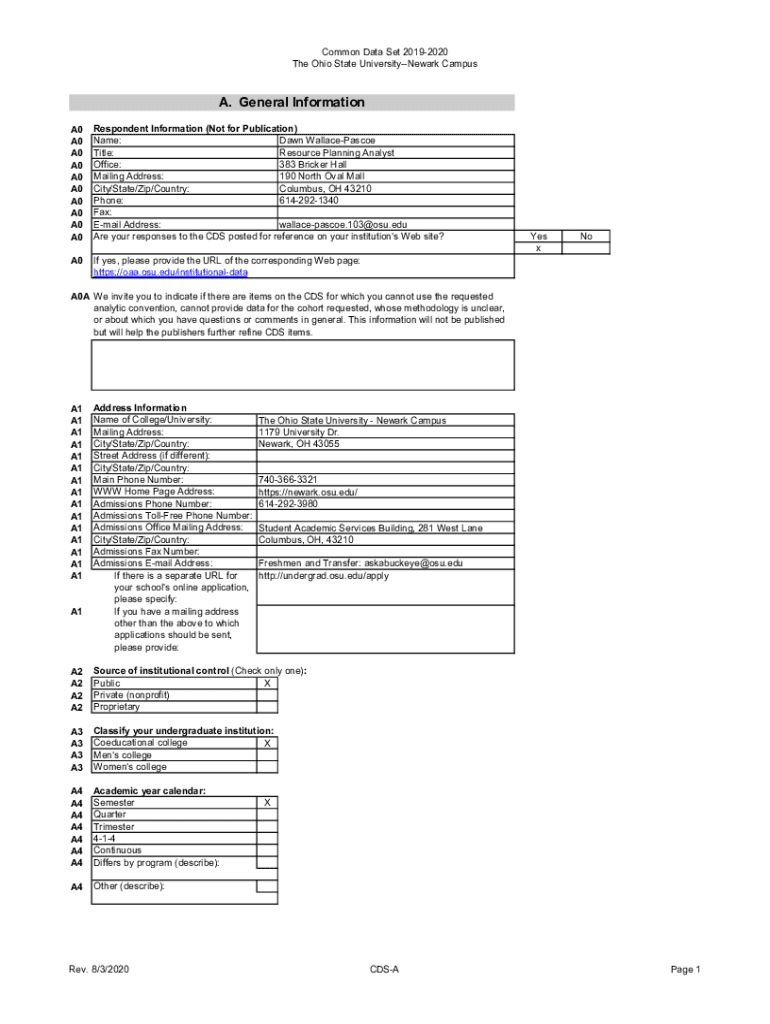 Common Data Set 20192020 The Ohio State University Newark Campus. General Information A0 A0 A0 A0 A0 A0 A0 A0 A0 A0Respondent Information (Not for Publication) Name: Dawn WallacePascoe Title: Resource
