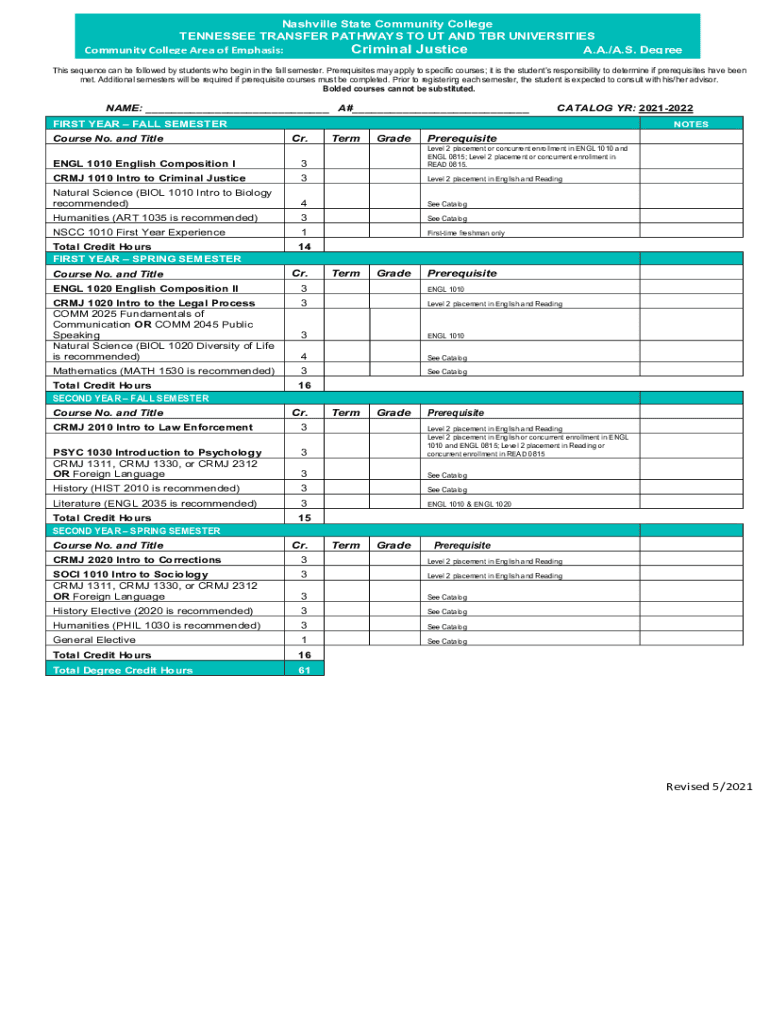 Nashville State Community College TENNESSEE TRANSFER PATHWAYS TO UT AND TAR UNIVERSITIES Community College Area of Emphasis: Criminal Justice A.A./A.S. Degree This sequence can be followed by students