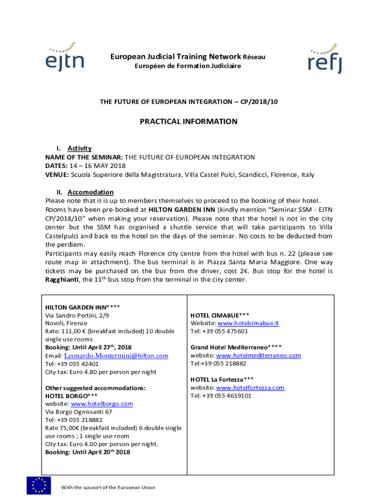 European de Formation JudiciaireTHE FUTURE OF EUROPEAN INTEGRATION CP/2018/10PRACTICAL INFORMATION